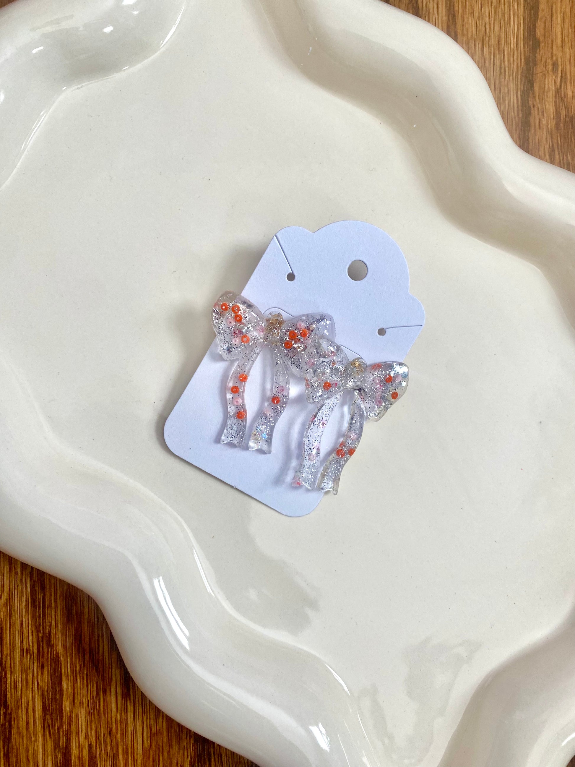 Add a playful sparkle to your look with these charming bow earrings! Perfect for themed parties or just brightening up your everyday style, these handmade acrylic bows bring a delightful pop of shine. They also make a sweet gift.
